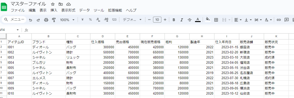 次のようなスプレッドシート「マスターファイル」のデータがあったとすると