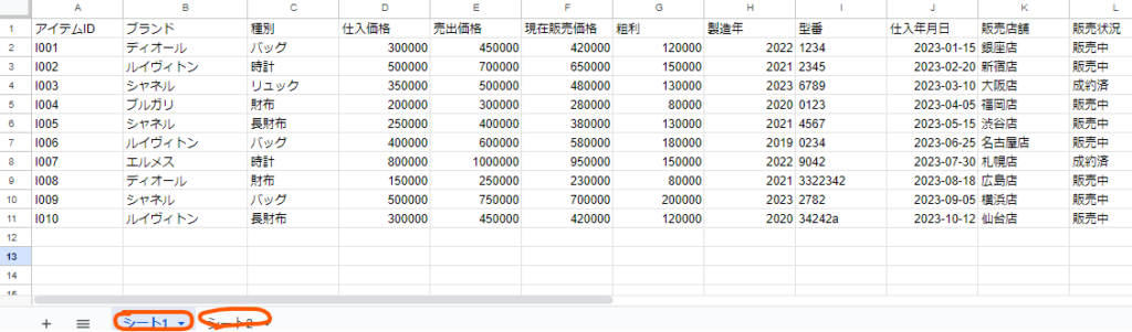 =QUERY(IMPORTRANGE(“https://docs.google.com/spreadsheets/d/xxxxxxxxxxxxxxxxxxxxxxxxxxxx/edit”, “シート1!A1:K10”), “SELECT Col5,Col6,Col7 where Col11 =’販売中'”, 1)