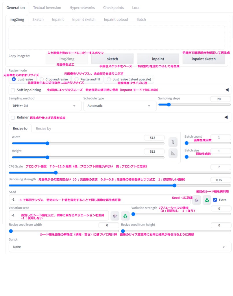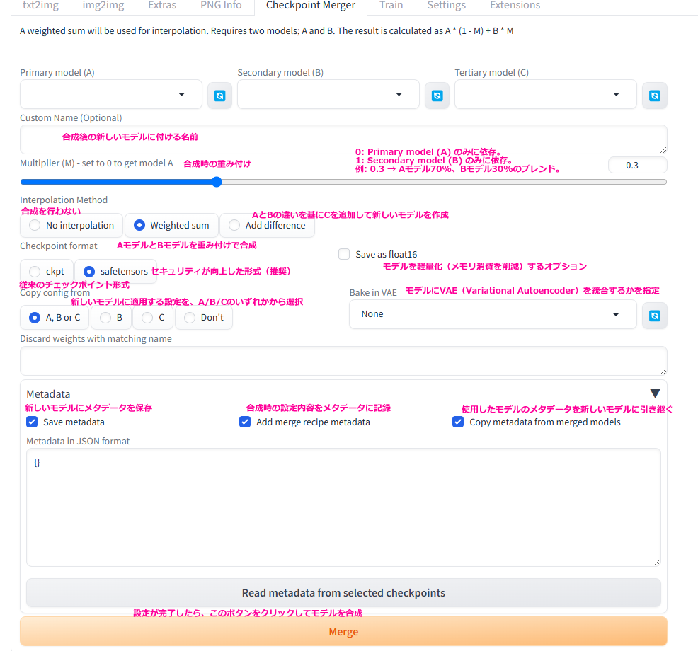 Stable Diffusionの設定画面の説明 公開日:2025年2月9日 ブログ Webui起動後のtxt2imgの画面 img2imgの画面 extrasの画面 checkpoint mergerの画面 関連記事 Windows11のタスクバーに新規ツールバーが無いので絶望Excel to Table (エクセルからtableに変換)htmlのtableをcsv形式に変換するNapkin AIでテキストtoイラストで図解してみたHTMLサイトのtableをGoogleスプレッドシートに持ってくるモチベーショングラフメーカー 投稿ナビゲーション Napkin AIでテキストtoイラストで図解してみたモチベーショングラフメーカー